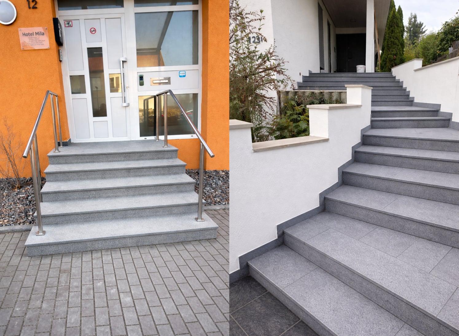 Eckig oder runde Podestplatten für Ihren Hauseingang mit Aussparrungen entlang der Mauer, abgestimmt mit Ihrer Haustüre.