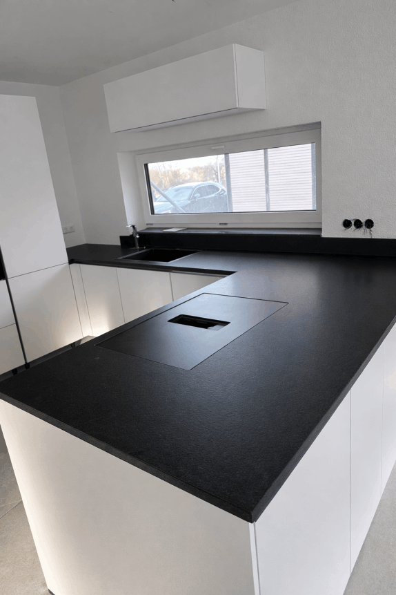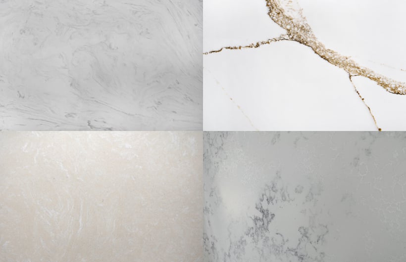 Kunststeine sind Quarz-Komposite und bestehen zu knapp 92% aus gemahlenem natürlichem Quarz, wodurch die Härte und Resistenz garantiert wird. Mithilfe von Polymerharz und Farbpigmenten wird das Quarzmehl in einer speziellen Presse unter hohem Druck, Vibration, Vakuum und Hitze zu Steintafeln verarbeitet.