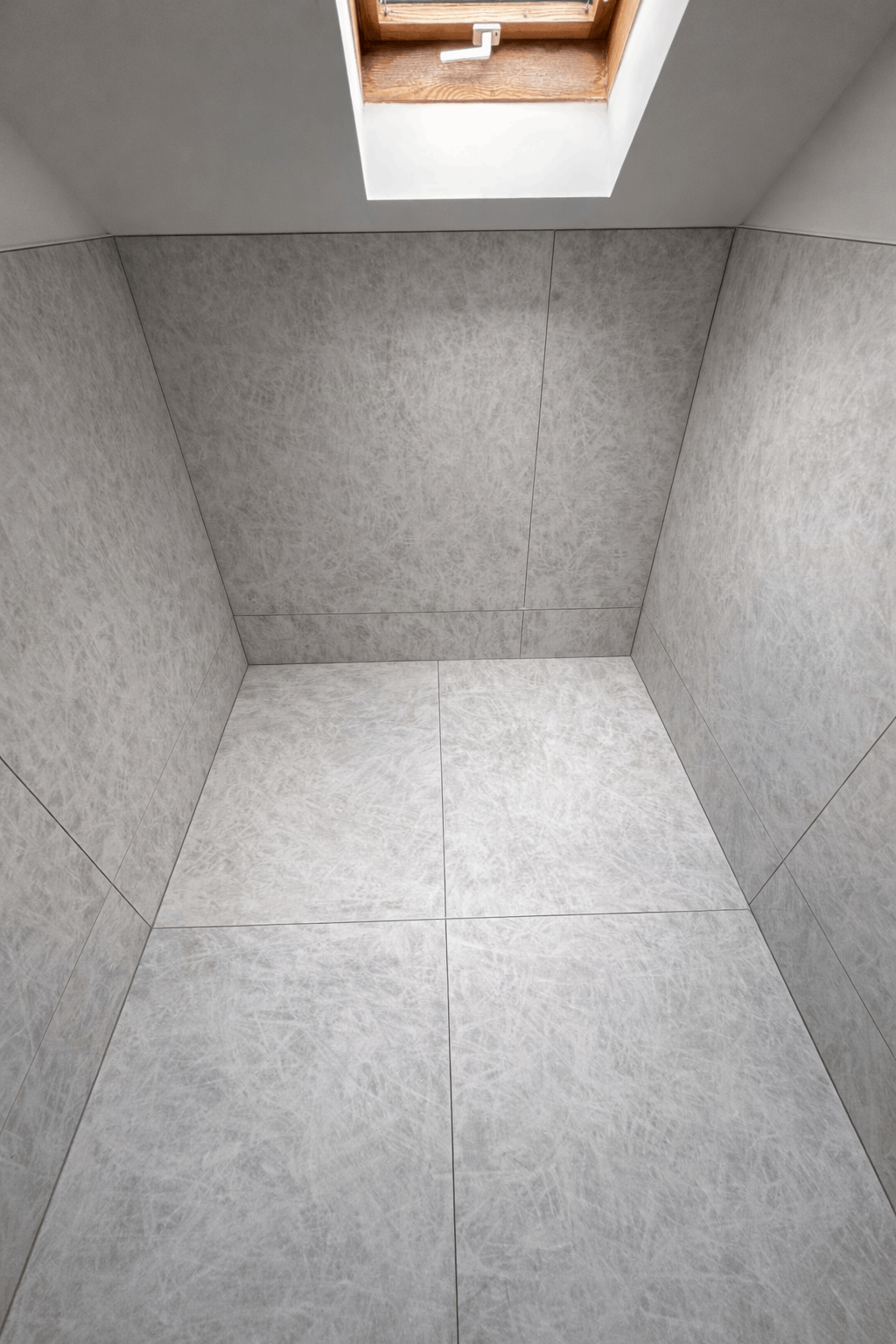Somit entsteht ein zusammengehöriges Bild über alle ausgestatteten Wände und Boden. Ein erheblicher Vorteil ist außerdem die Minimierung der Stoß-Fugen.