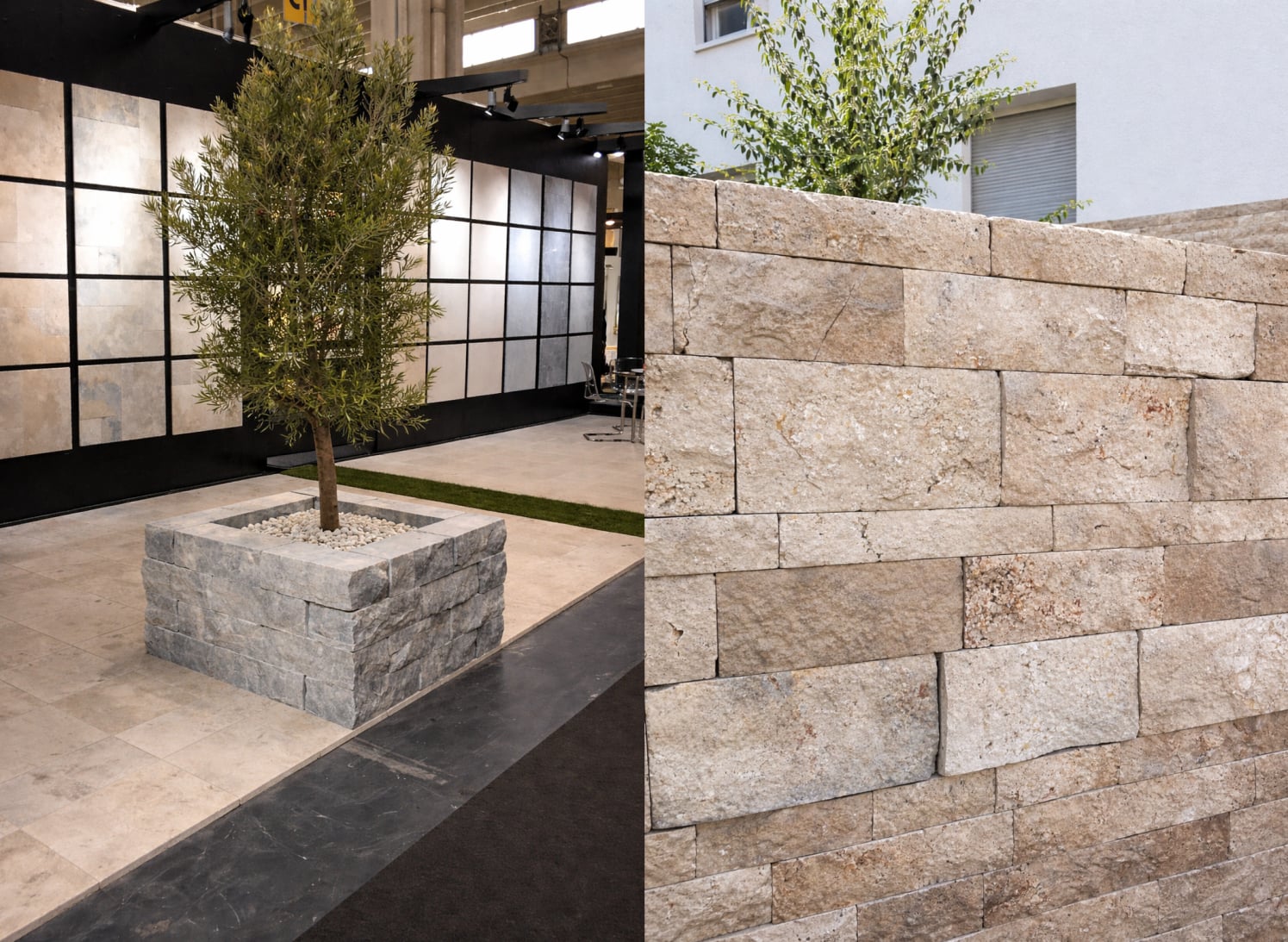 Um ansprechendere Stoßkanten hervorzurufen sind bei Mauern die Ecken oder Auf- und Abgänge umfassen 45-Grad Schnitte und individuelle Gehrungsschnitte möglich.