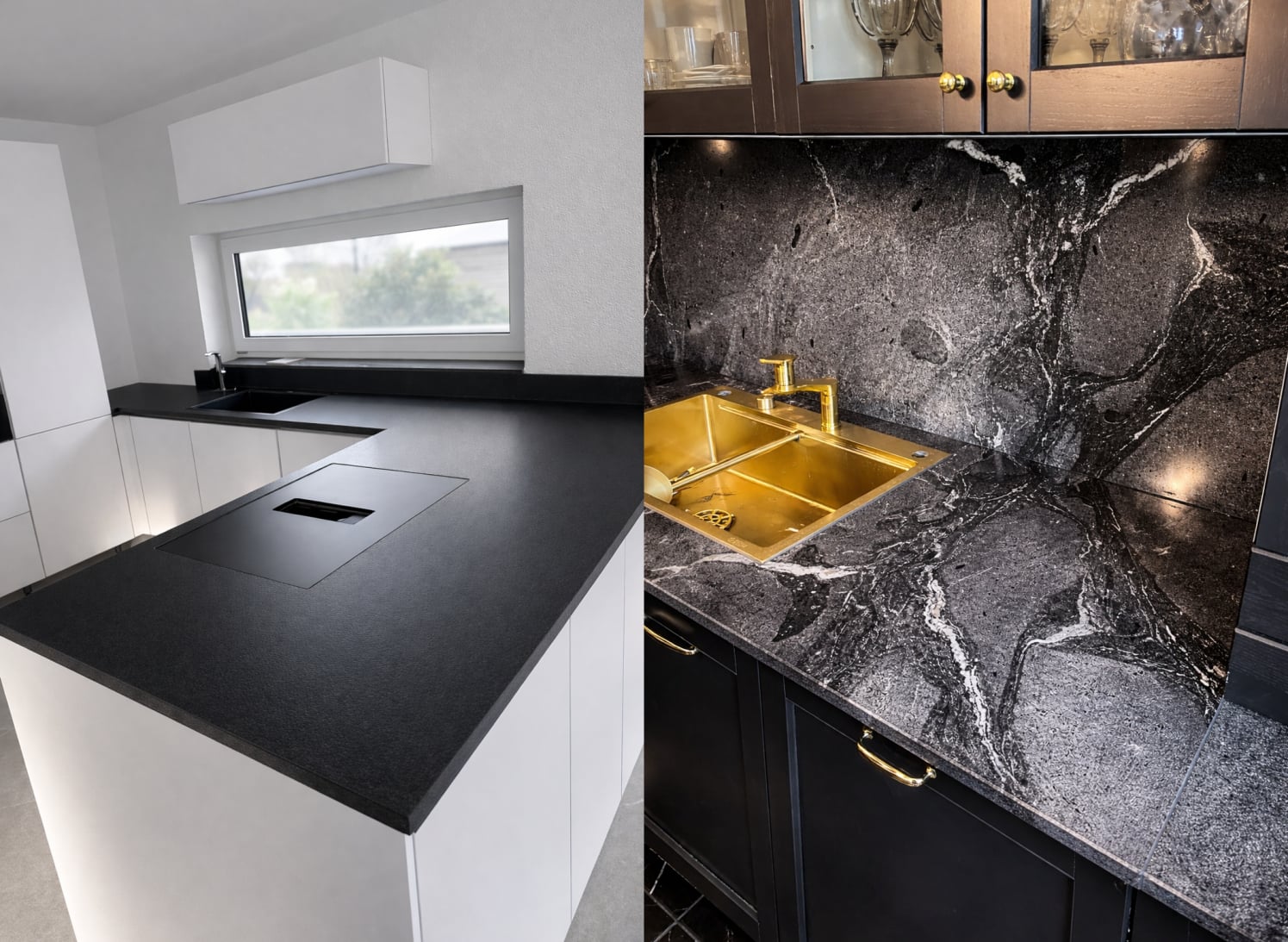 Die Aussparung der Herdplatte, einer Steckdose und das Spülbecken können wir aufsetzbar oder flächenbündig verarbeiten. Für das Spülbecken können wir außerdem auch eine untersetzbare Verarbeitung anbieten.