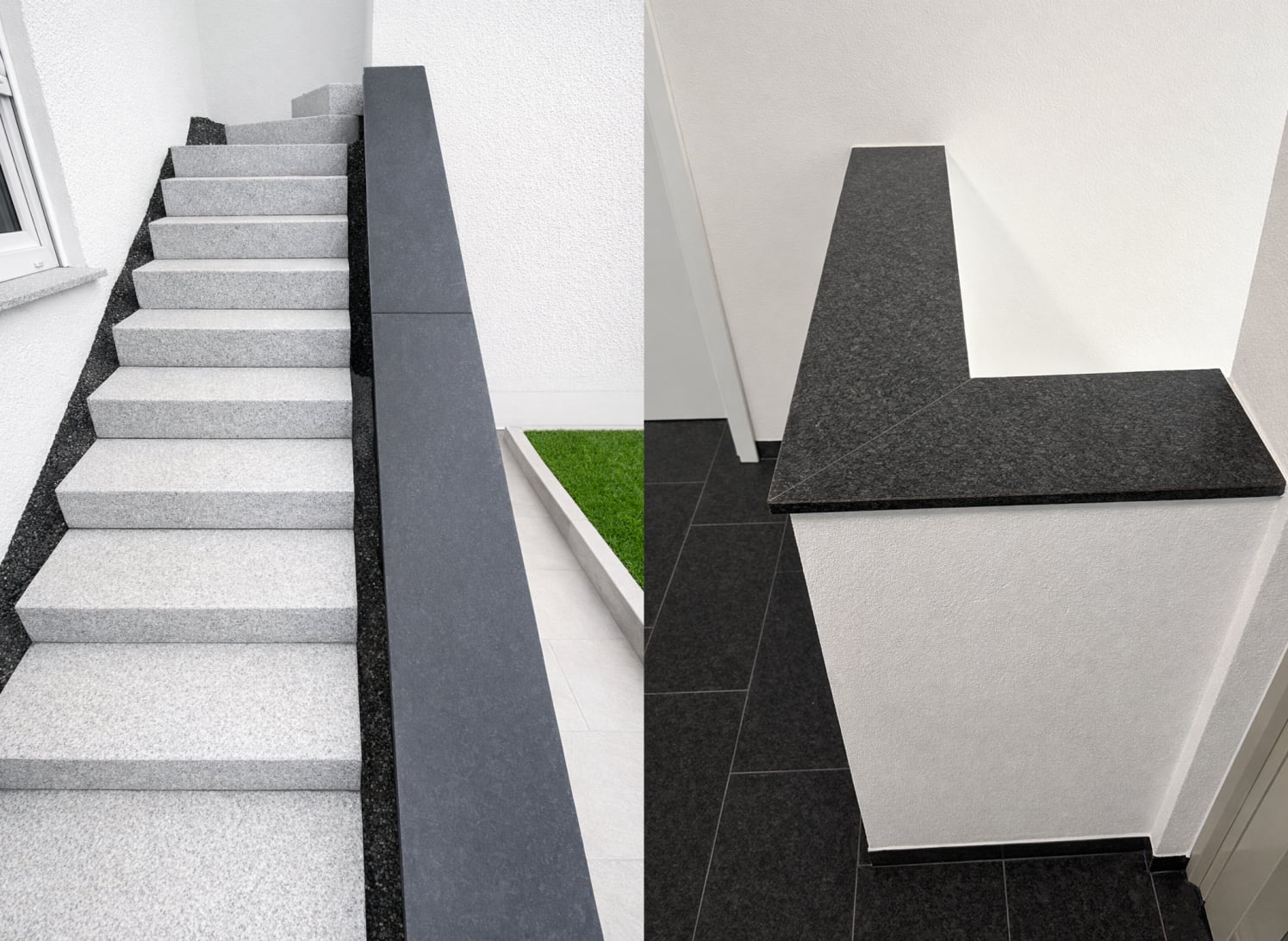 Eckig oder runde Podestplatten für Ihren Hauseingang mit Aussparrungen entlang der Mauer, abgestimmt mit Ihrer Haustüre.