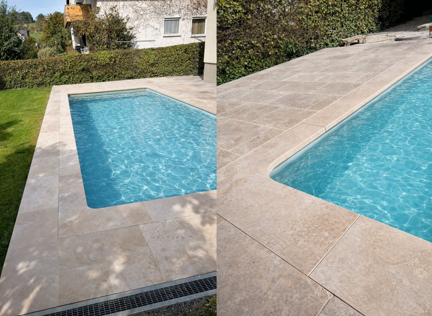 Das letzte Detail rund um den Pool sind meistens die Umrandungsplatten. Entsprechend Ihrer Wünsche und Anforderungen beraten wir Sie gerne wie z.B. Temperaturbeständiger Travertin oder hitzespeichender Granit.
